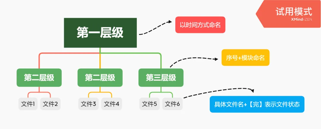从以上可以看出,整个文件管理分为三个层级,第一层级是以时间周期方式命名,存放当下这一阶段的所有工作文件,第二层级以编号+文件名的方式命名,分类存放工作中各个模块的任务,第三层级直接以具体文件名方式命名,不再编号,但是用【完】这一符号加文字标志文件的是否完成。