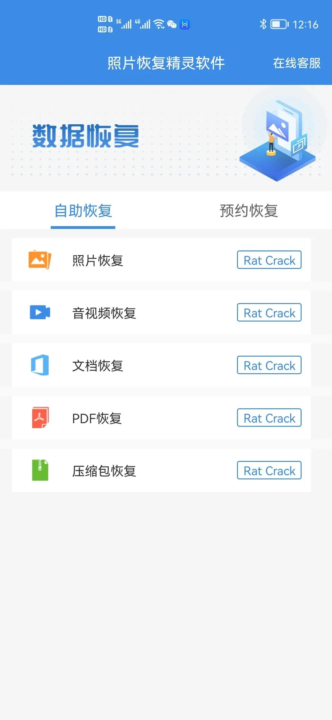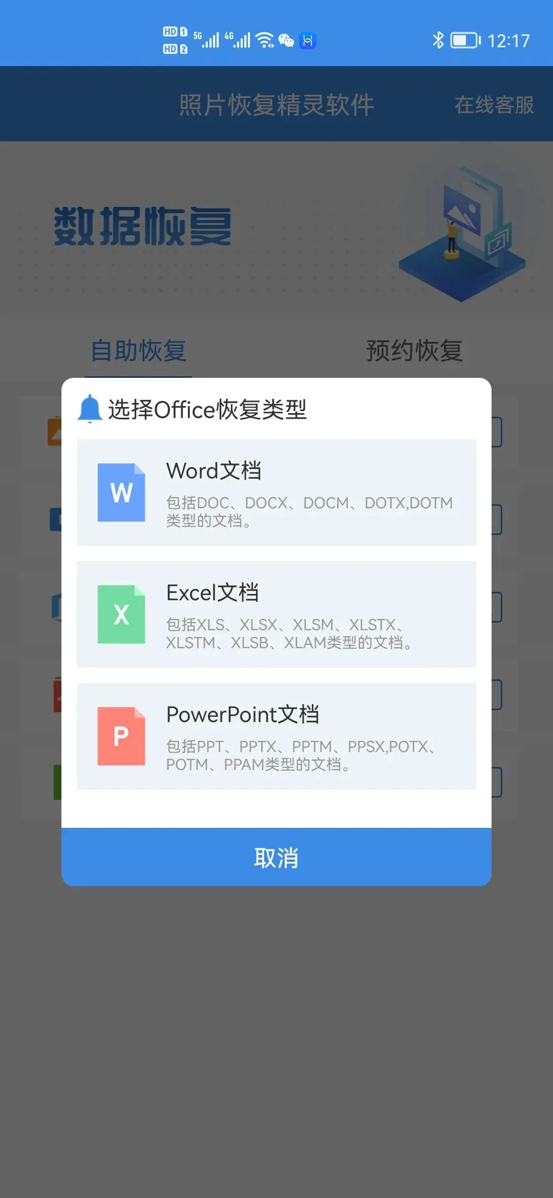 打开应用首页,可以看到有图片恢复、音视频恢复、文档恢复、PDF恢复和压缩包恢复五种模式。