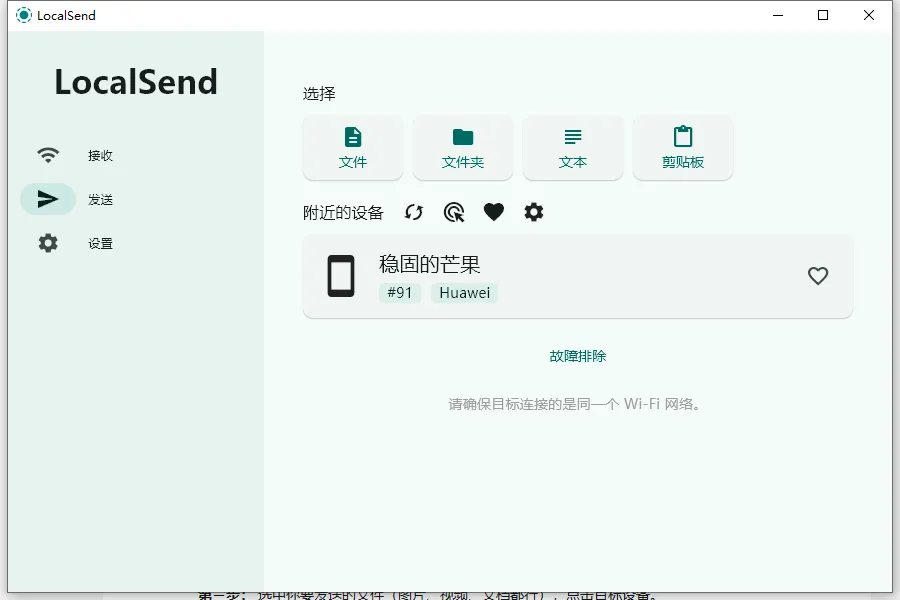第二步:在两台设备上都打开 LocalSend。软件会自动发现局域网内的其他设备,并分配一个有趣的代号(比如“聪明的香蕉”)。