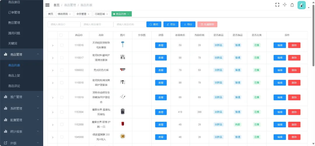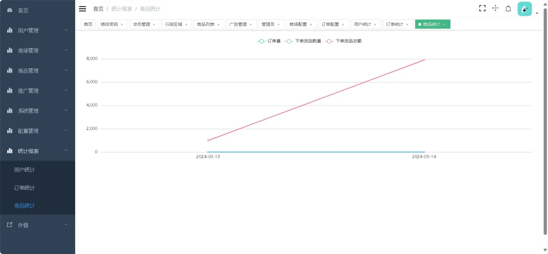 会员管理、商城管理、商品管理、推广管理、系统管理、配置管理、统计报表