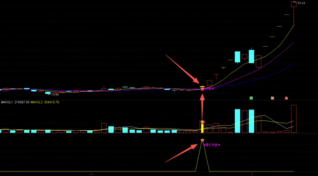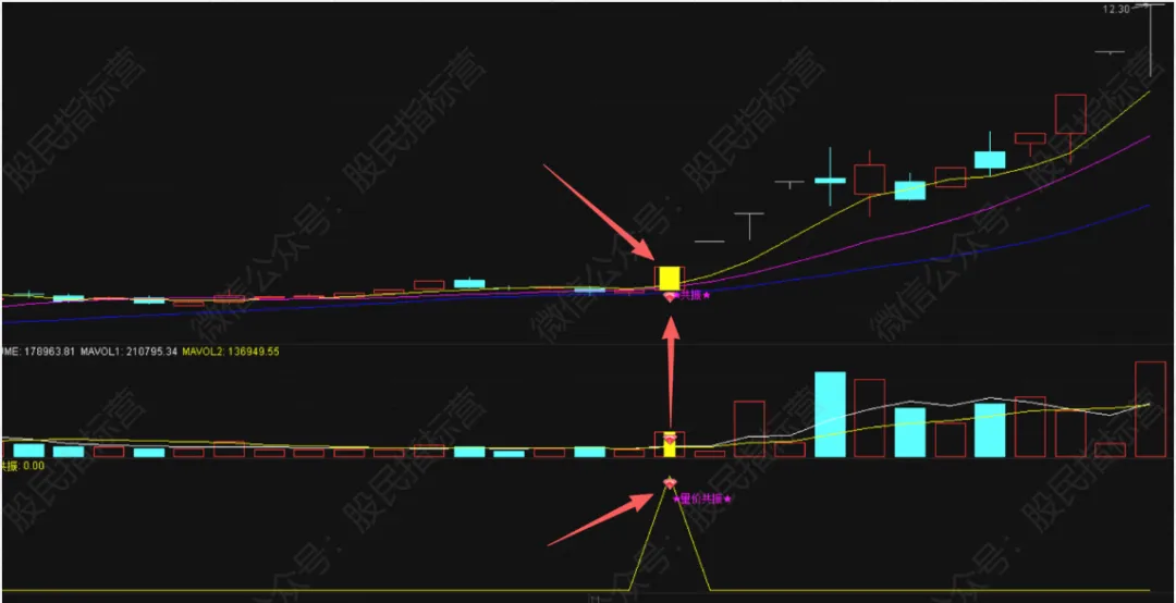DRAWTEXT(量价共振,0.8,’ ★量价共振★’)COLORMAGENTA;