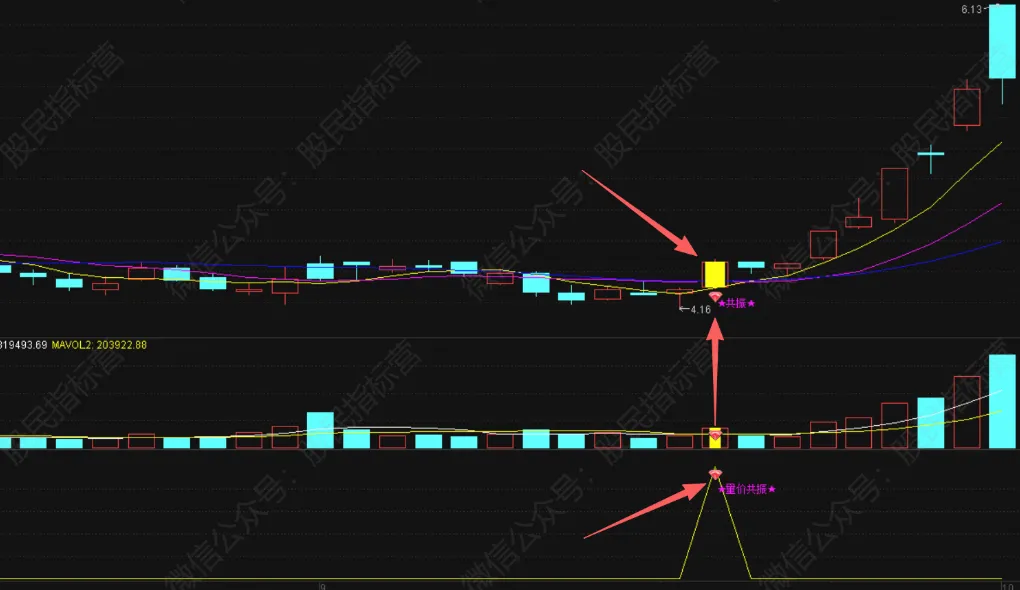 DRAWTEXT(量价共振,L*0.98,’ ★共振★’)COLORMAGENTA;