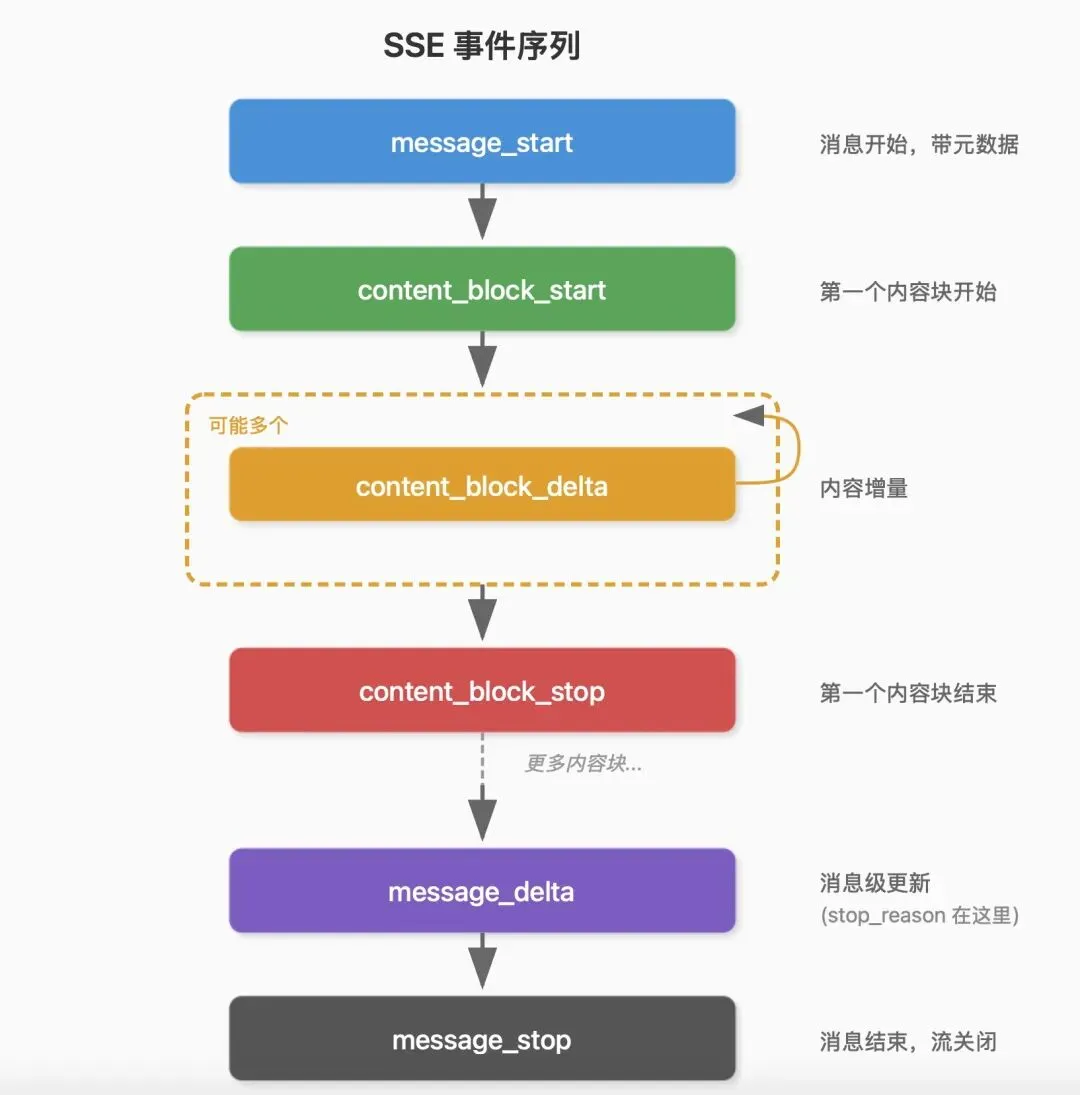 // 文本增量{ type: "content_block_delta", index: 0, delta: { type: "text_delta", text: "我来" } }{ type: "content_block_delta", index: 0, delta: { type: "text_delta", text: "看看" } }// 工具参数增量(JSON 是分片的!){ type: "content_block_delta", index: 1, delta: { type: "input_json_delta", partial_json: '{"file_' } }{ type: "content_block_delta", index: 1, delta: { type: "input_json_delta", partial_json: 'path":"' } }{ type: "content_block_delta", index: 1, delta: { type: "input_json_delta", partial_json: '/src/index.ts"}' } }