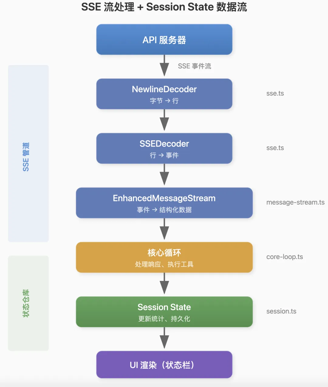 这一篇补上这两块:SSE 流处理和Session State 管理。听起来是两个独立的话题,但其实紧密相关——SSE 是数据流入的管道,Session State 是数据落地的仓库。理解了这两块,再看核心循环的代码就会更清晰。