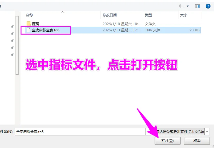 在电脑上找到你要导入的指标文件,然后选中文件,点击下方的打开按钮。