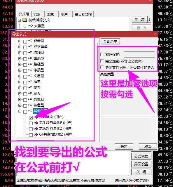 然后再左侧找到要导出的公式打钩,可以一次导出多个公式。右上角是加密选项,按需勾选。