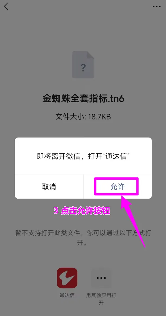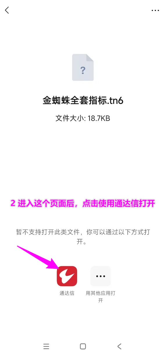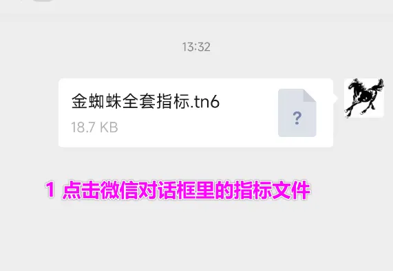 手机导入指标的方法更简单,我们一般都是用微信发送指标文件。在微信对话框内,点击指标文件,选择使用通达信打开,就直接导入进去了。