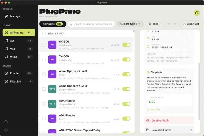 PlugPane是一款插件管理器,能扫描电脑中已安装的AU/VST/VST3格式插件,显示所有插件的存储位置,帮助发现重复安装,并让用户在DAW之外组织管理和标记插件库。