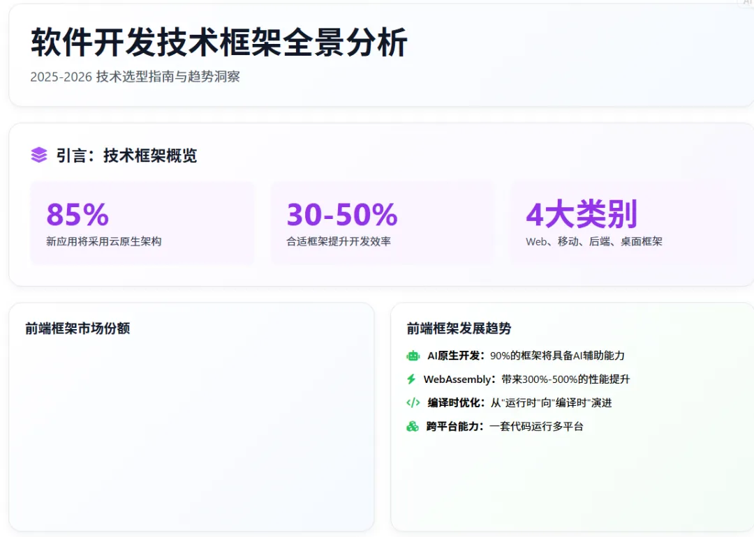 在数字化转型加速的 2026 年,技术框架已成为软件开发的核心基础设施。根据最新市场调研数据,全球 85% 的新应用将采用云原生架构,而技术框架的选择直接影响着项目的开发效率、维护成本和技术演进能力。一个合适的技术框架不仅能够提升开发效率 30-50%,还能显著降低长期维护成本,成为企业技术竞争力的关键因素。