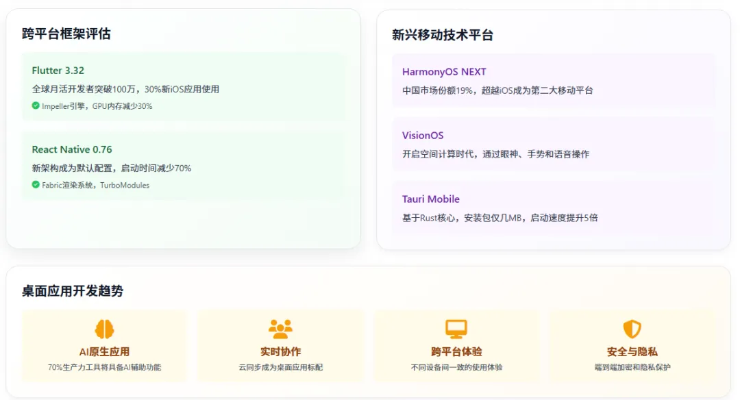 移动应用开发进入了 “原生与跨平台融合” 的新阶段。Flutter 以 46% 的开发者采用率领跑跨平台开发,其在性能、一致性、开发效率等方面的优势得到了市场验证;React Native 通过新架构的全面普及重新获得竞争力;而原生开发框架如 SwiftUI、Jetpack Compose 则通过不断的技术创新保持着在高端市场的地位。特别值得关注的是,HarmonyOS 作为中国市场的新势力,已占据 19% 的份额,展现出强大的增长潜力。