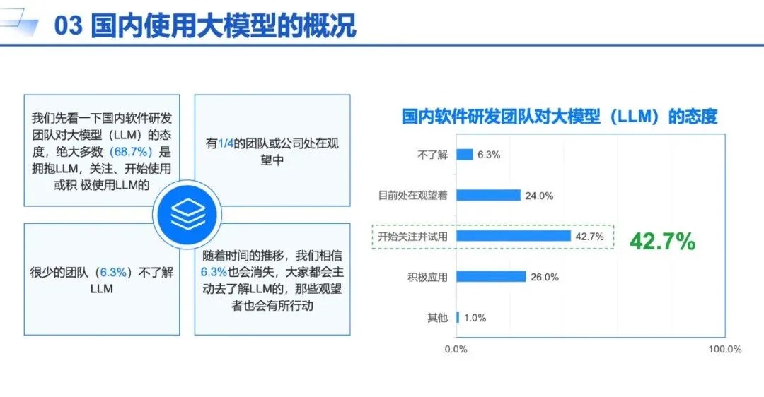 基于大模型的智能开发和智能测试等工具的应用,为软件生产过程提供了更自动化更高效的方法。例如,通过代码生成、代码补全和问答等能力,软件开发人员能够更迅速地编写高质量代码,显著减少手动调试和错误修复时间。同时,该类工具的使用可降低项目对开发人员的依赖,基于工具的学习和记忆能力,不仅可以辅助新的开发人员快速开发出符合项目需求和规范的代码,还可以帮助开发人员快速学习新的编程语言,从而减少人员流动带来的项目风险。根据CSDN 2024年调查数据显示,AI技术已成为我国软件开发者工作中不可或缺的一部分,有69%的开发者表示正在使用AI工具,38%的开发者认为AI编码辅助工具可以减少20%至40%的工作量。