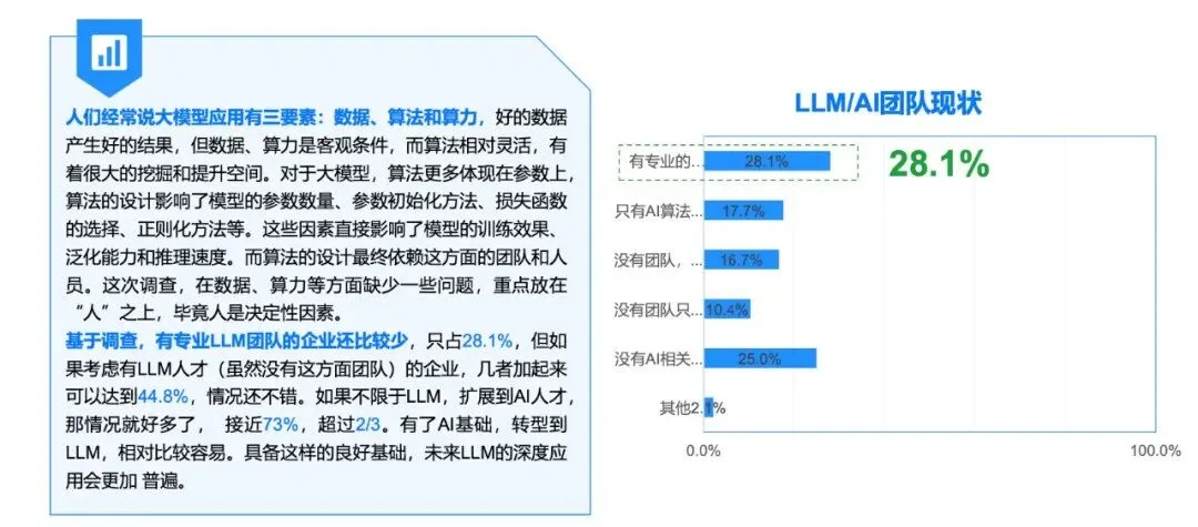 智能化转型面临着文化重塑、认知提升和人才结构优化等维度的挑战。一是组织文化的重塑,其落地要求组织具备开放合作、持续学习和创新的文化氛围,促进跨部门沟通与协作,打破信息孤岛;二是全员认知水平的提升,自上而下每位员工都应深刻理解智能化的潜力与挑战,客观且正确地了解大模型等人工智能技术及其作用;三是人才结构的调整与补充,由于数据治理及模型训练调优等过程需要专业技术人员参与,因此补充人才,或调整或融合AI团队和软件工程团队的结构,方能匹配能力建设和应用需求。
