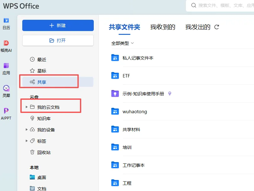 步骤三:在左侧“共享”或“我的云文档”里新建文档,或把已有的本地文档直接拖到这里面即可。