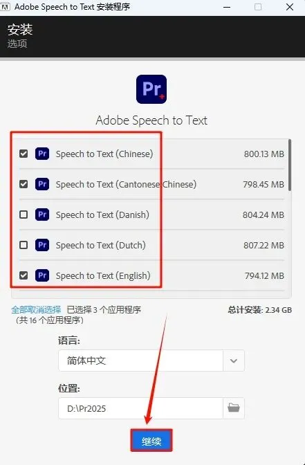 3.勾选需要的语言(建议不常用的不要勾选安装),选择软件安装路径,建议和教程中的保持一致,本例安装在D盘(可以在其它磁盘里创建一个新的文件夹,安装路径不要出现中文),点击“继续”