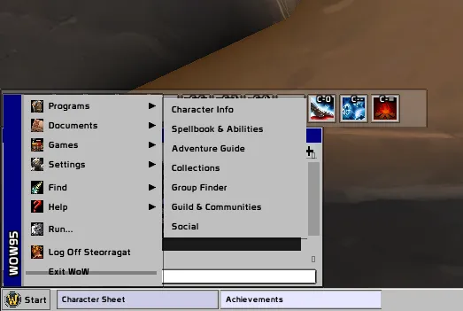 这款插件可以将玩家的《魔兽世界》界面改造成复古感十足的Windows 95桌面主题风格。插件的每个窗口、按钮和对话框都是作者全新制作的,主要使用了游戏内置引擎和一些外部素材。