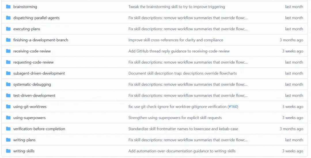 Superpowers的核心是一套「技能(Skills)库」,每个技能对应一类架构师的典型工作场景,比如: