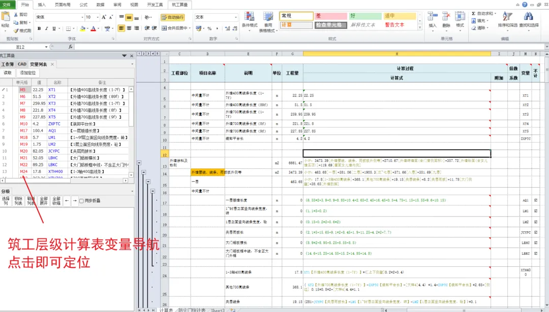 更新:筑工算量插件版20260115 1、表格增加变量导航 2、表格增加“从单元格算值”功能。 将指定单元格的计算式值输入到活动单元格中: 结果: 3、安装算量表格新增一键提取相同块、曲线,操作视频如下 以下为历史更新: 1、优化表格算量工具 2、墙柱提取增加承台识别统计、 3、优化喷淋识别算法参数,更高的准确度,断线判定更准确。 附上期更新操作视频: 表格工具粗糙的教程: 补充更新:增加汇总表筛选功能:应用场景: 计算工程量时候要根据特征不同来分开计算,经常会出现分项工程量不一样,但是可能总量是一样的,因此核对过程中经常会先对下总量,此时可以直接利用原始数据,进行总量筛选合计,或者统计其他包含某关键字的工程量总量。 1、新增板计算工具 2、新增土建计算表 3、CAD计算表增加保存与读取功能、以及自动备份功能。 增加Cad数据自动归并方式:自动/当前行。尺寸提取更灵活。 4、增加喷淋识别功能,视频操作如下: 上次更新: 更新:筑工算量插件版20251001