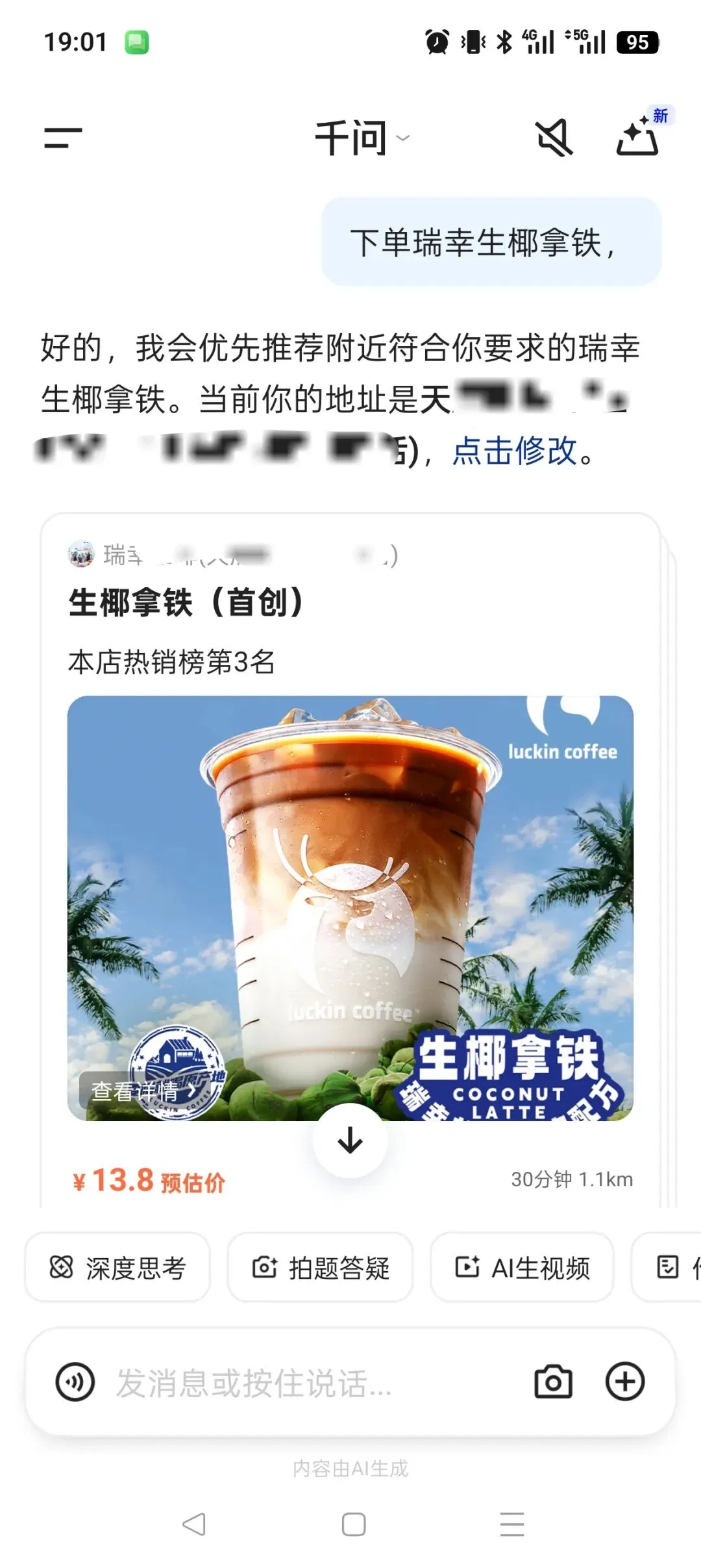 🚀 操作极简:用户给 AI 下达「帮我点杯奶茶」的指令,系统会瞬时调用淘宝闪购本地资源,自动匹配就近门店、生成订单。 -