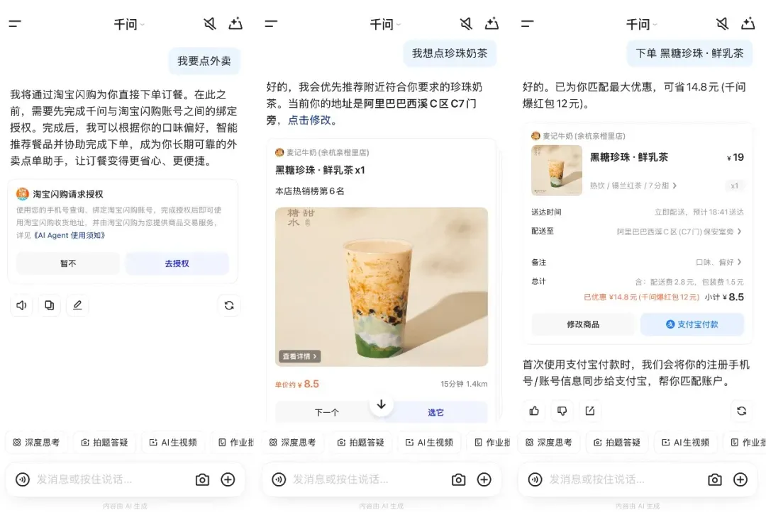 用户只需在聊天界面输入如“帮我点杯奶茶”,系统即可自动调用淘宝闪购服务,完成商家智能匹配、订单生成,并通过内置的“支付宝AI付”一键完成支付——全程无需跳转应用,真正实现“说一句,就送到”。