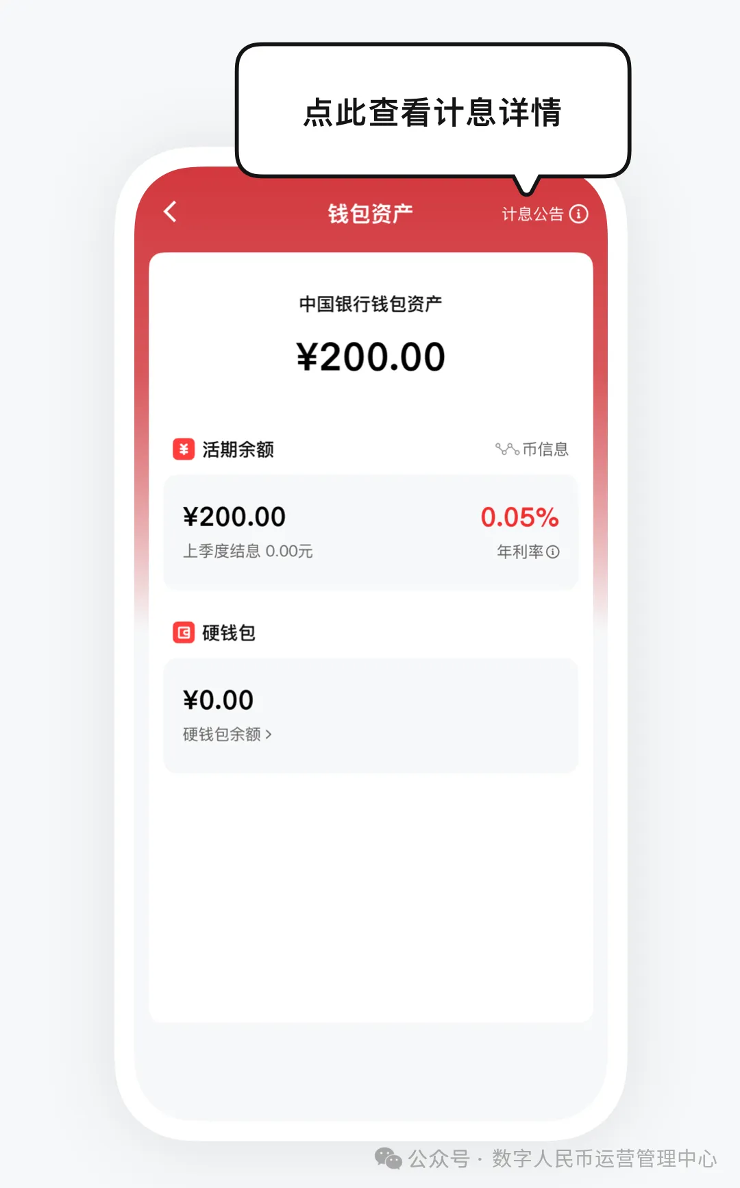 每季度末结息日之后,用户点击首页的钱包资产区域,进入钱包资产页,即可查看结息详情。