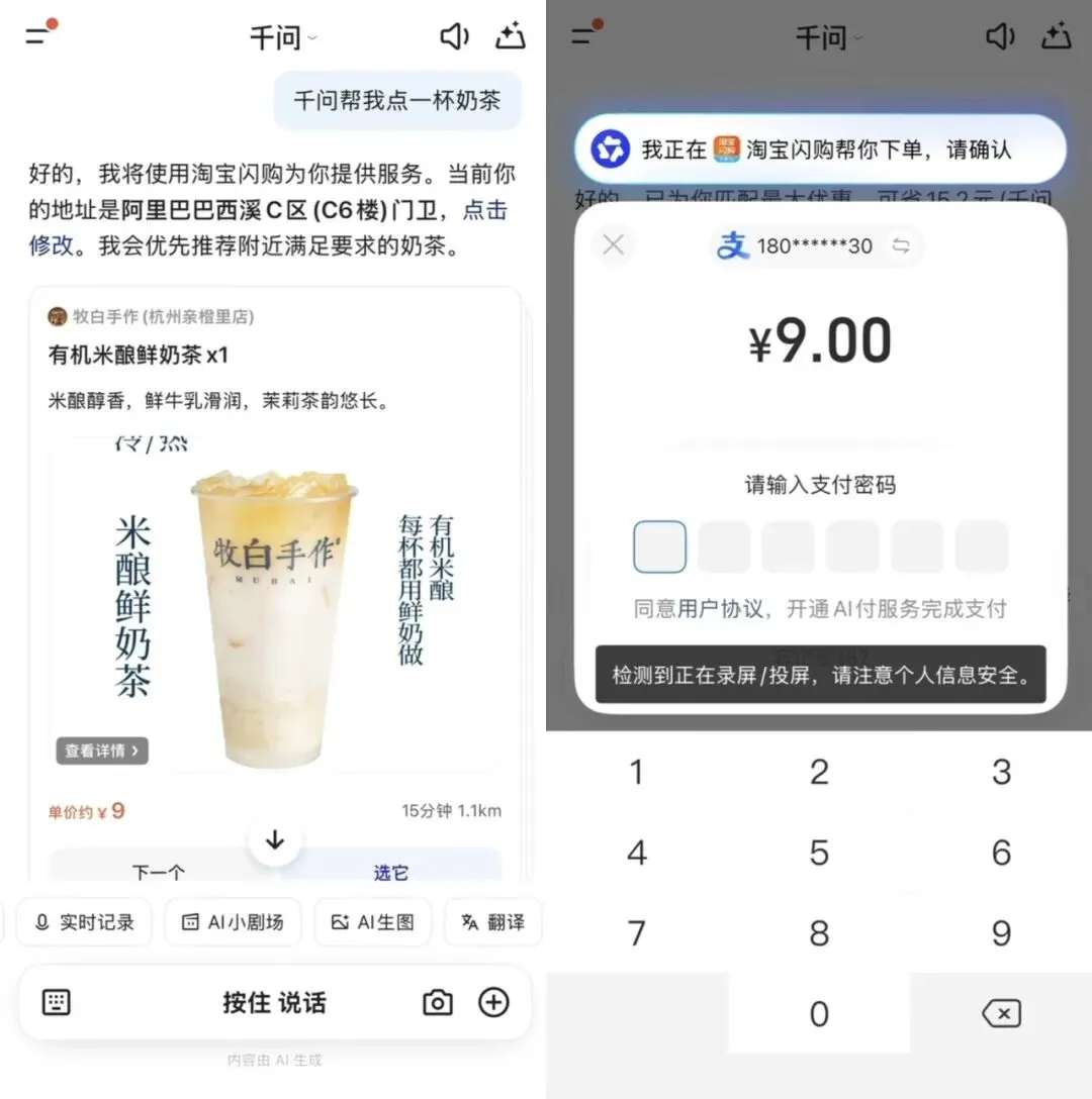用户只要在AI“初筛”过的品牌和商品中,选择自己心仪的那一款商品,选择下单,千问App就在本App内,调用支付宝,请用户输入支付密码,就完成支付,可以坐等奶茶送上门了。