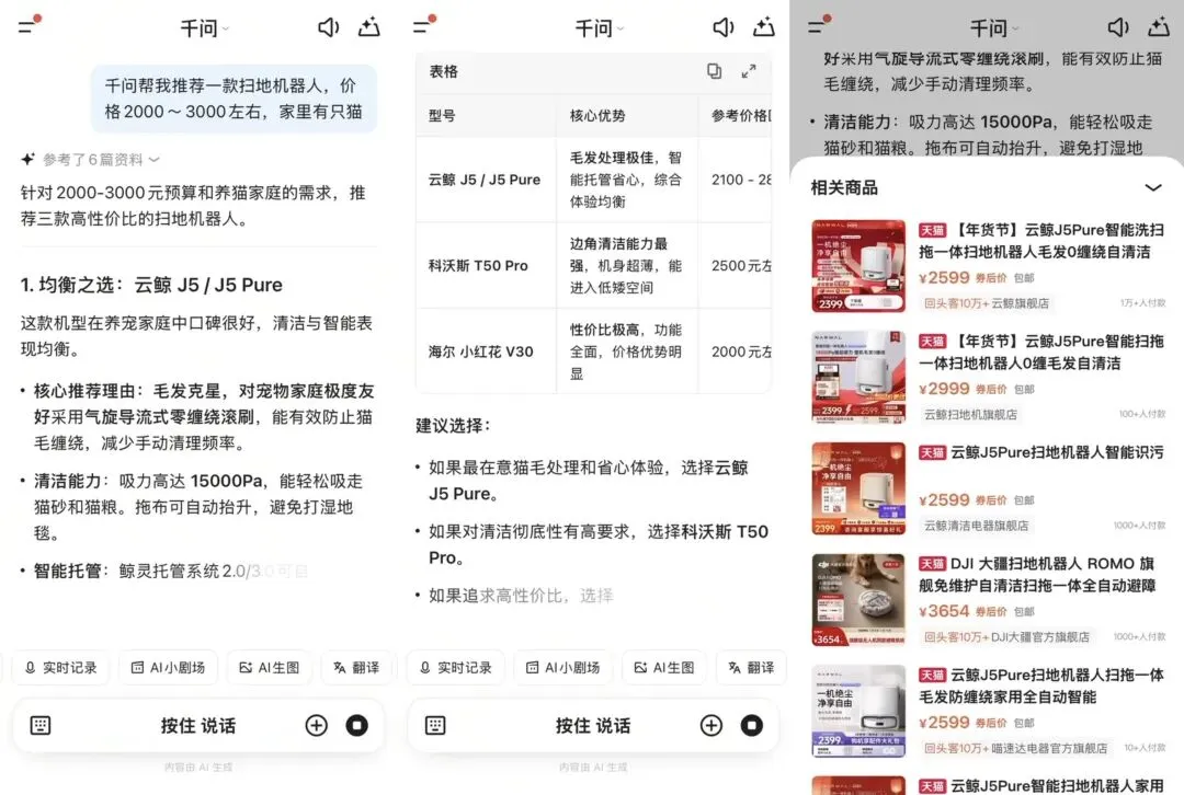 图说:千问App快速给出“给父母买一台扫地机器人,2000-3000元,家里有只猫”的淘宝购物建议