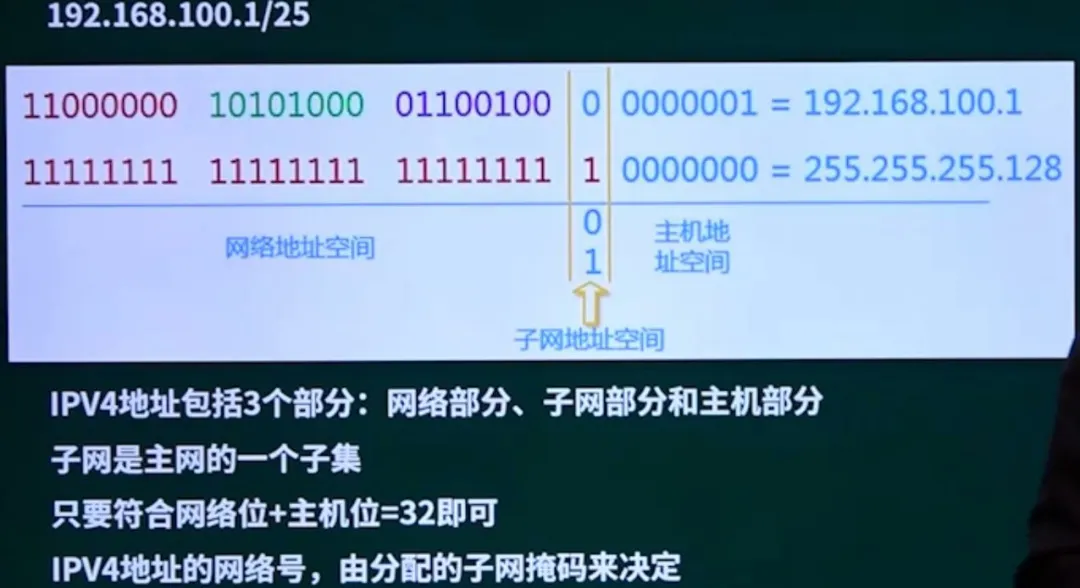 192.168.100.1/25:C类网络,这里25表示网络位为25位,借用主机位中的一位作为子网掩码,主机位变为7位。