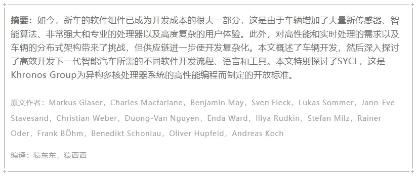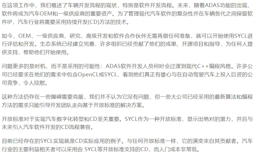 尽管SYCL是一个相对较新的标准,但它已受到越来越多的关注,各种供应商都已宣布或已经发布了对SYCL的支持,包括CPU和GPU供应商(AMD ROCm、Intel)、FPGA供应商(Xilinx、Intel)和其他供应商,例如,Renesas/Codeplay为R-Car提供支持。这种广泛的采用以及适用于许多不同平台和架构的特性,使SYCL成为未来汽车软件开发的一个非常有趣的候选者。第6节将更详细地讨论SYCL。