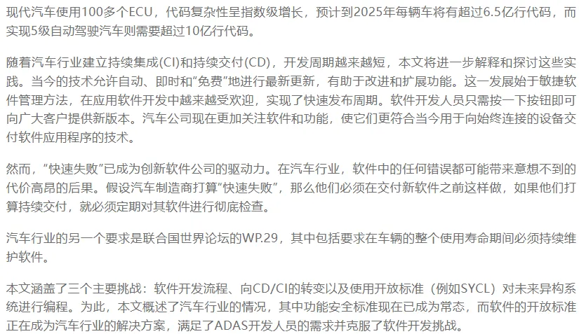 随着软件复杂性呈指数级增长,理想的目标是缩短开发时间。随着OTA软件更新的预期增加,应用程序的软件开发最近已成为汽车生产线中最具挑战性和最昂贵的部分之一。由于传统的汽车约束仍然必不可少,因此仍需要广泛的安全性、质量和可靠性需求。这会影响创新和成本的速度,给开发团队带来交付压力。此外,软件数量的增加伴随着复杂性的增加,架构受到特定汽车需求的影响,例如硬实时、高可靠性和安全性、有限的资源、成本压力、短开发周期和领域知识的异构性。