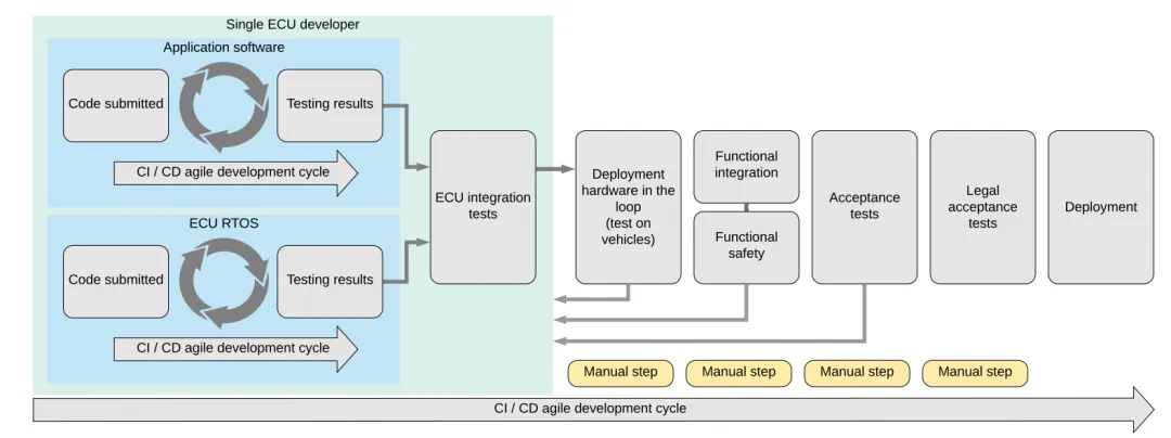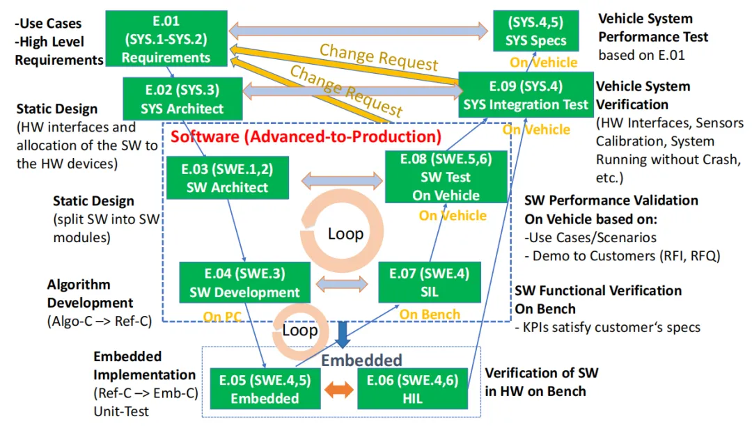 就图7中的ASPICE V模型而言,汽车开发和生产的标准流程,软件应用程序开发只是SWE.3“软件详细设计和单元构建”的一个框,但移植是在SWE.4“软件单元验证”中完成的,涉及整个生产流程。还有许多其他组件需要满足,包括系统、硬件需求、质量保证、测试和验证。整个周期可能需要长达三年的开发时间。实际上,软件解决方案的进步更新迅速,其复杂性显著增加。这意味着在软件技术的快速发展中没有可用且固定的解决方案。这需要一种新的发展策略来赶上快速而复杂的变化。