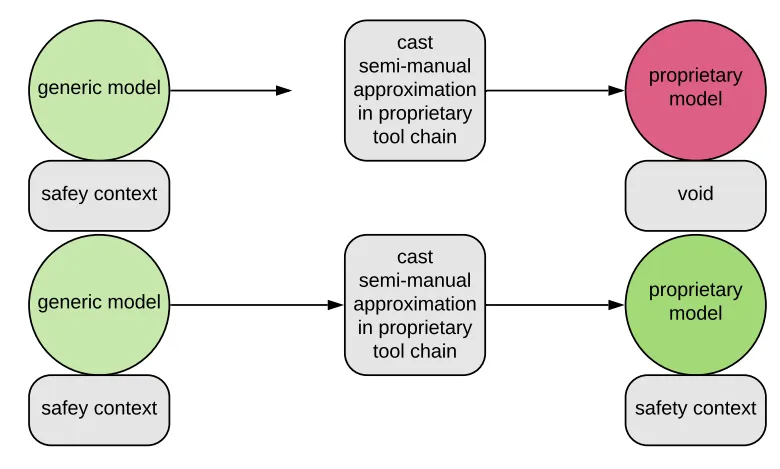 图6描述了使用非标准/专有工具向专有目标的转移。首先,工具链覆盖范围有限,通常包括手动和容易出错的步骤。安全上下文丢失。此外,移植到目标隐式地需要某些近似值(例如转换为定点、减少位深度),由于现代(判别性)深度神经网络(DNN)的非连续性,其影响往往是不可预见的。工具开发与项目特定任务之间没有脱钩。相反,必须在此流程中解决挑战。