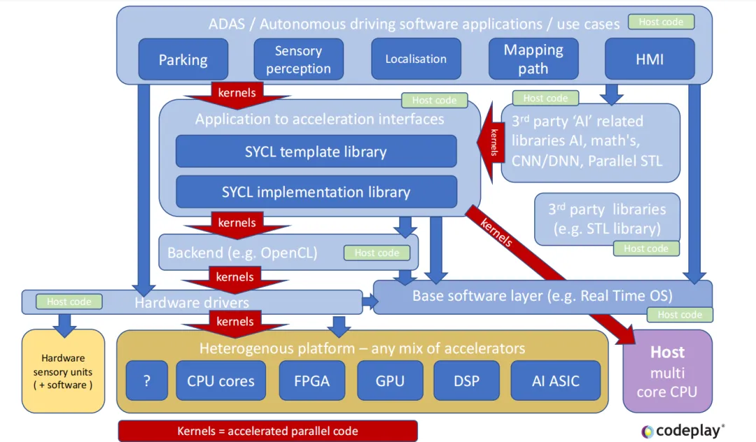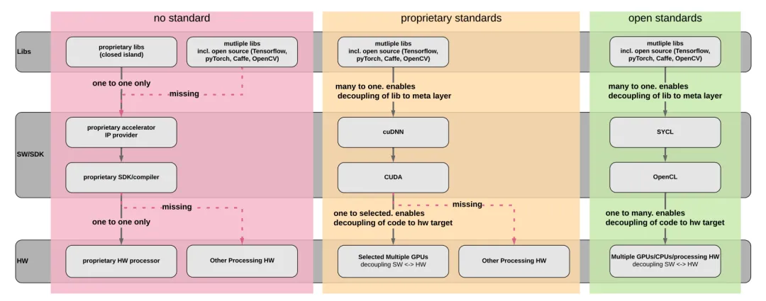 然而,与任何其他专有标准一样,CUDA有一个主要缺点,即潜在的供应商锁定的危险。生产就绪的编译器仅由Nvidia提供,并且仅适用于Nvidia设备(目前仅限GPU)。这使得汽车公司最重要的资产之一,即其生产软件代码面临高风险,因为转向Nvidia以外的供应商可能会使整个现有CUDA代码库几乎毫无用处。除此之外,专有编程模型通常仅在非常有限的一组设备上可用。就CUDA而言,编程模型和API只能用于Nvidia GPU,而不能用于异构系统的其他重要组件,例如多核CPU、FPGA或专门用于AI的定制加速器。