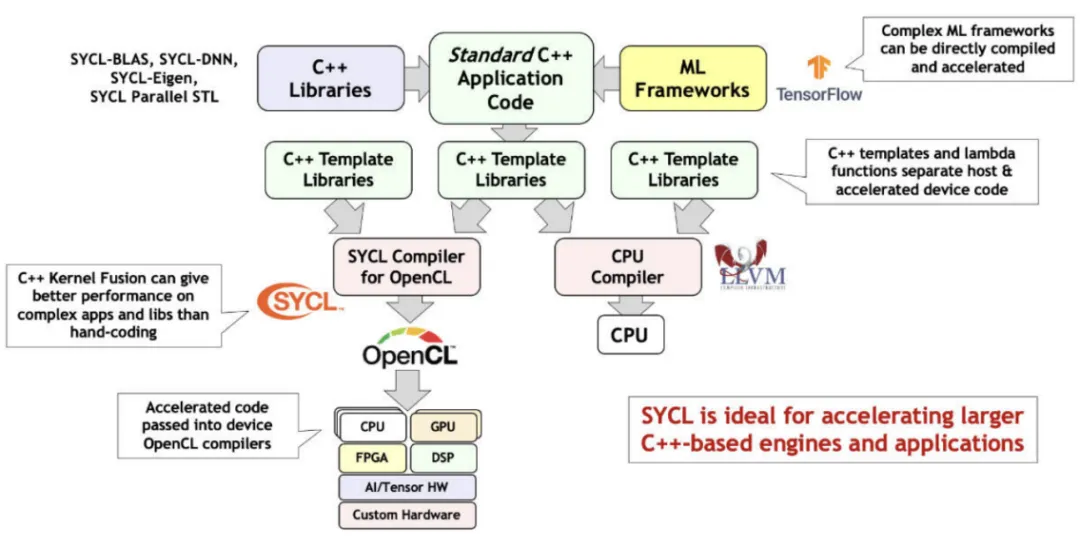 根据Khronos Group的说法:“SYCL是一个基于C++的标准异构并行编程框架,用于在各种处理器架构(包括CPU、GPU、FPGA和AI处理器)上加速高性能计算(HPC)、机器学习、嵌入式计算和计算密集型桌面应用程序。”