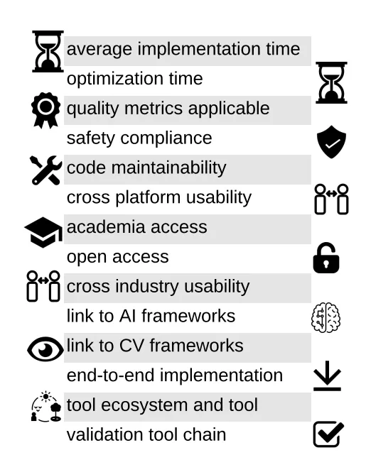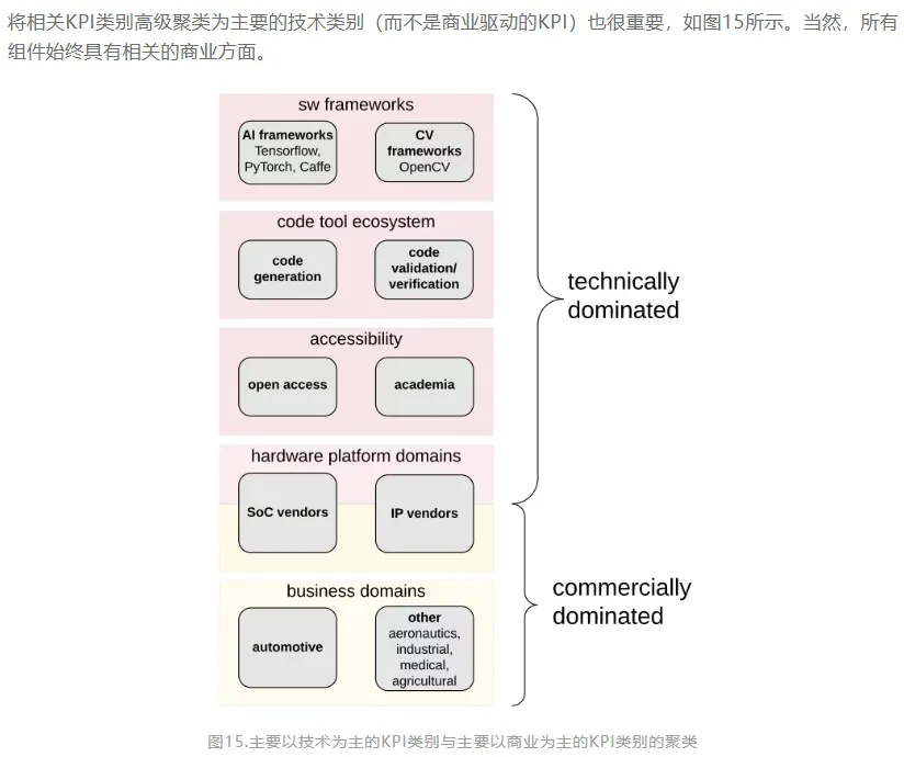 在开发周期中,需要各种KPI来评估、量化和评定汽车软件项目的能力。这种多维KPI需要分数权重来汇总为一个分数。权重可能取决于项目目标、供应链角色和用户范围。然而,人们强烈地感觉到,以下项目与该领域的大多数用户相关,其中人工智能、计算机视觉和可维护性的重要性权重越来越大。图13描绘了主要相关KPI领域的高级概述。