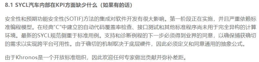 本节中提到的所有开放标准的共同点是,它们都由多党派机构维护,例如架构审查委员会(ARB)或SYCL和OpenCL的Khronos工作组。这些开发和维护开放标准的机构为利益相关者提供了一个参与这些标准开发的合适平台,并为汽车行业提供了一个提高对其特定需求的认识的机会。