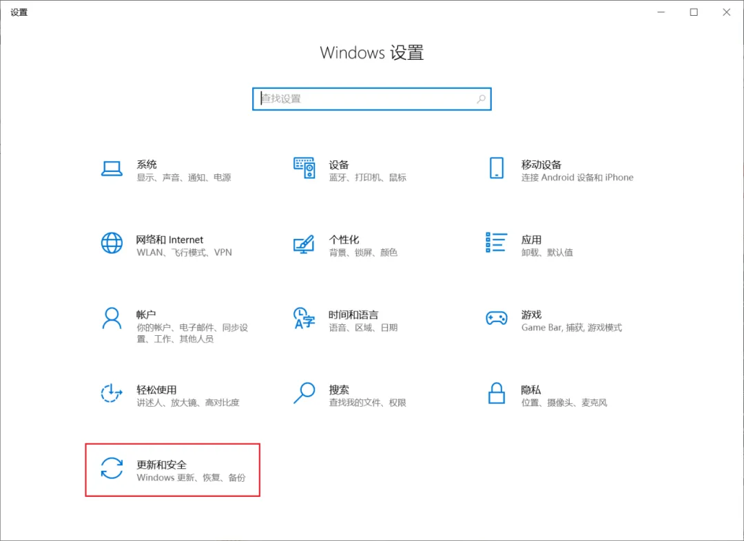 1.在电脑左下角图标,打开Windows设置,再单击“更新和安全”。