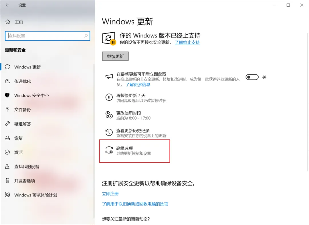 2.在windows更新面板,点击高级选项
