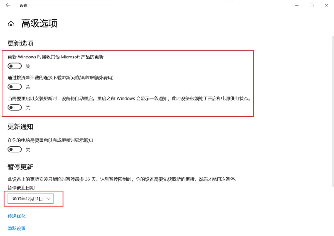 3.在高级选项面板中,将更新选项中的选择项改为关闭状态,暂停更新中原暂停截止日期最多35天,现在已改为3000年12月31日