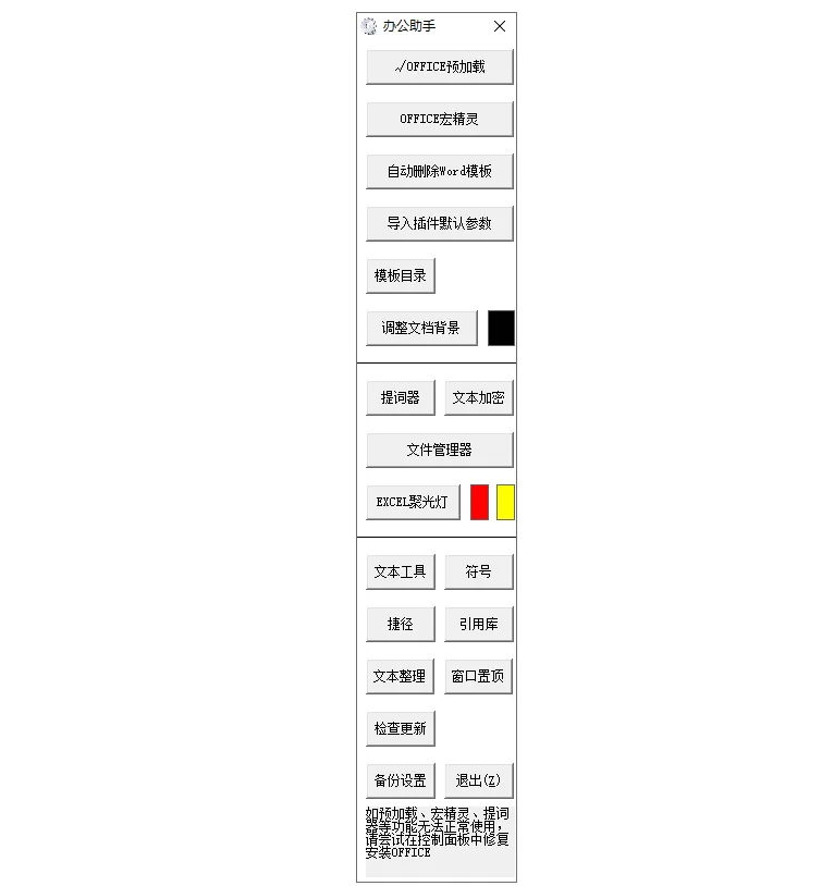 公文处理助手:(1)简化操作步骤(2)提高工作效率(3)提高准确性(4)规范文档格式(5)支持批量文档操作(6)脚本功能自主编写各种脚本,实现操作简化和功能扩展办公助手:(1)自主创建Word、Excel、PowerPoint加载项,自动识别宏代码中的过程名,列表显示,双击执行(2)根据OFFICE组件窗口自动切换列表,支持事件响应(3)快速查询相关常用信息(4)快速分类查找Unicode符号,双击复制(5)捷径类似Quicker,快速启动常用程序和打开文件