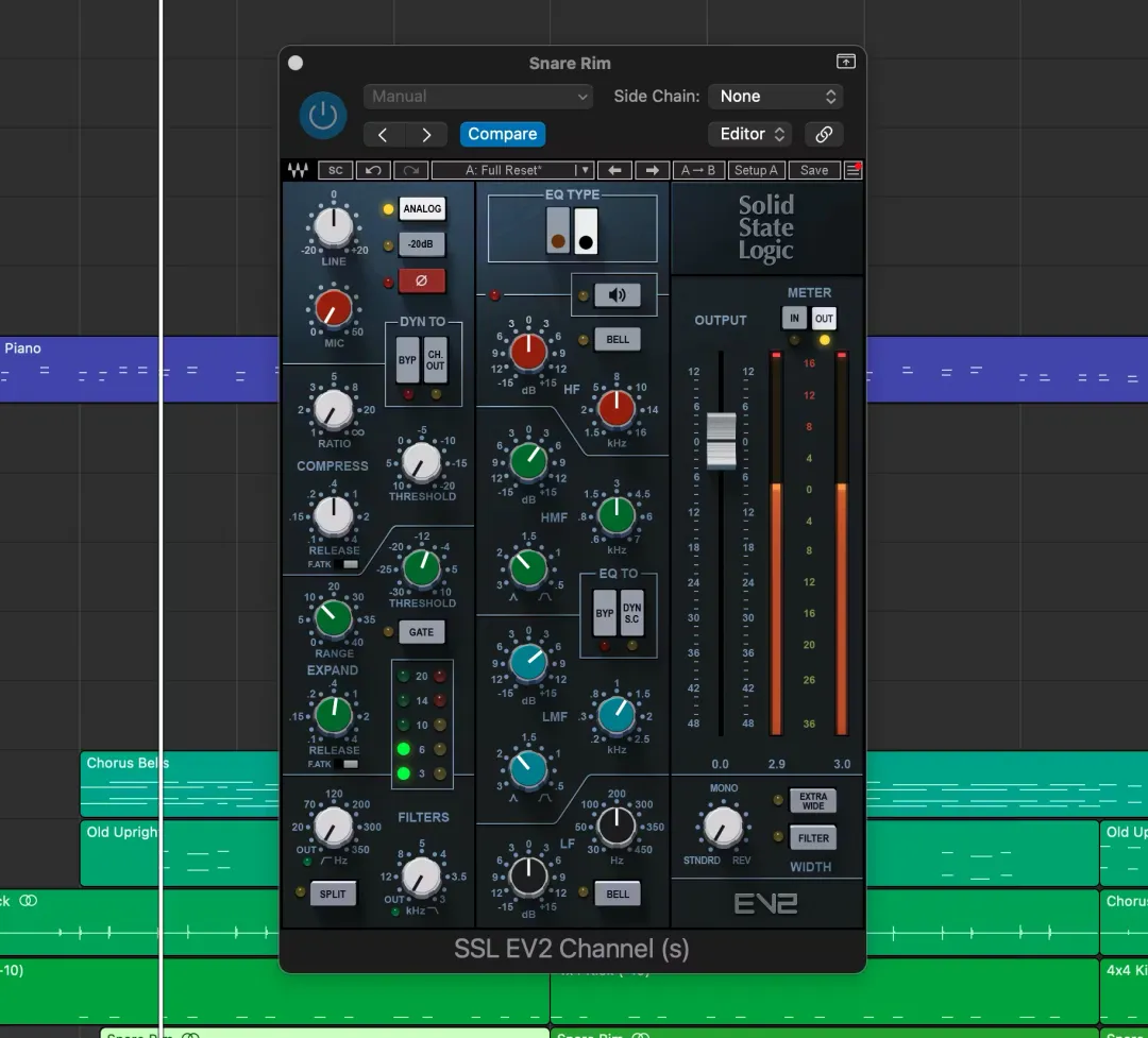 在压缩之前进行均衡处理,本质上是预先处理音频信号,使得压缩器能够处理更干净、更平衡的信号。例如,如果先削减浑浊低频或抑制刺耳高频,压缩器就不会对这些问题频率“反应过度”。这是最常见的做法,在许多模拟调音台上,混音师们通常都会首先调整滤波和均衡模块。不过,SSL调音台一般也允许你在均衡之前进行动态处理。