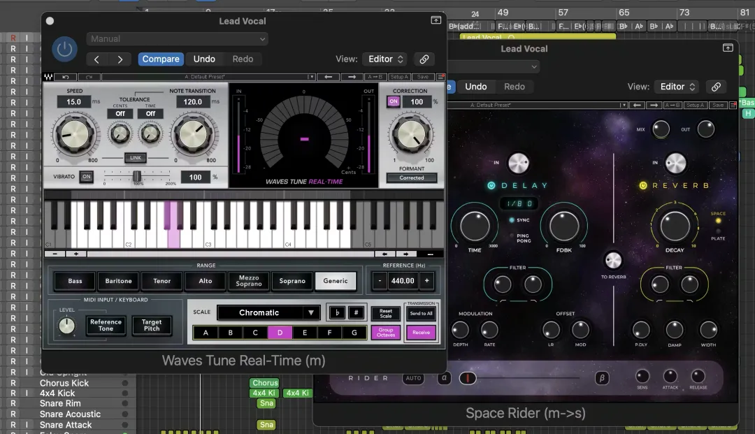 原因如下:像Waves Tune Real-Time这样的调音插件,设计就是用于处理单音音高信息(例如单条人声)。如果在调音器之前添加混响或延时效果,这些效果会产生重叠的尾音和反射。原本清晰的人声突然就变成了复杂的复音信号。调音器此时必须在相互冲突的音符之间做出猜测,通常就会导致声音模糊、不自然或“颤音”等问题。