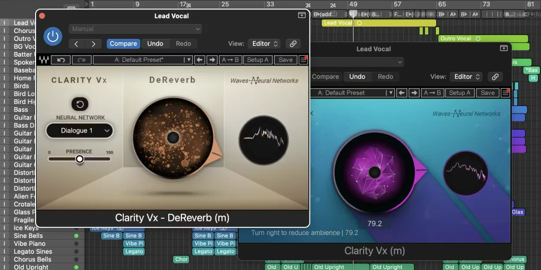 先抑制混响/房间声:录音中如果包含过多的自然房间混响,就会掩盖实际的音高。在这种情况下,先用Clarity DeReverb,然后再用Clarity Vx和你选择的调音插件。这样能去除多余的环境混响,然后再清除剩余的噪音。