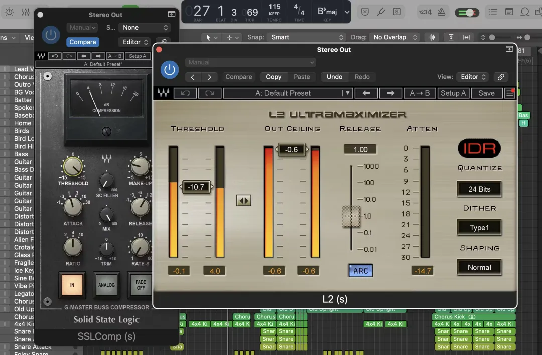 在混音总线或母带链路中,限制器几乎总是放在最后。它的作用简单但重要:防止杂散的峰值出现削波,控制最终动态余量,并且设置混音的最大输出电平。