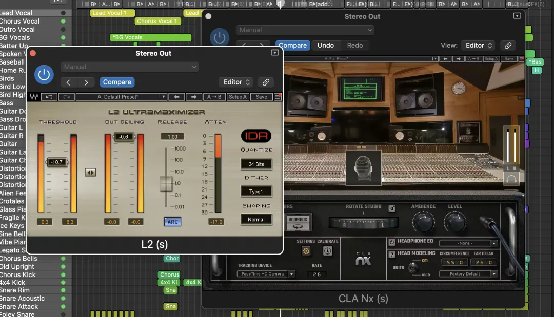 另一种常见例外是扬声器或耳机校准软件,例如Waves Nx。Nx系列插件可以模拟在专业录音棚或校准的扬声器上聆听的体验,让你在耳机进行高品质混音。这种处理必须放在信号链路末端,甚至在限制器之后,才能使你听到的声音尽可能接近真实的监听环境。但是,Nx仅针对监听用途而设计。在导出最终混音时,你应该始终把它们旁通掉。如果开着Nx,监听模拟效果就会被加入到母带中,那不是你希望听众会听到的。