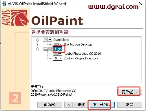 插件位置选择,先点击【Plugin】,然后下面路径显示,点击【Change】进去更改到ps软件的Plug-ins位置下(路径查找方法:选择ps软件,鼠标右键打开文件所在的位置进入安装目录位置,找到Plug-ins文件夹打开进去,复制此路径过来即可)。确定好位置后点击下一步