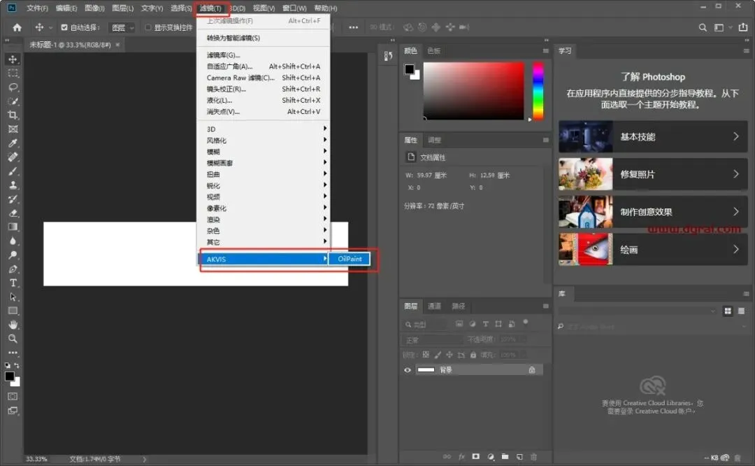 打开PS软件,新建文档,点击滤镜-AKVIS-OilPaint