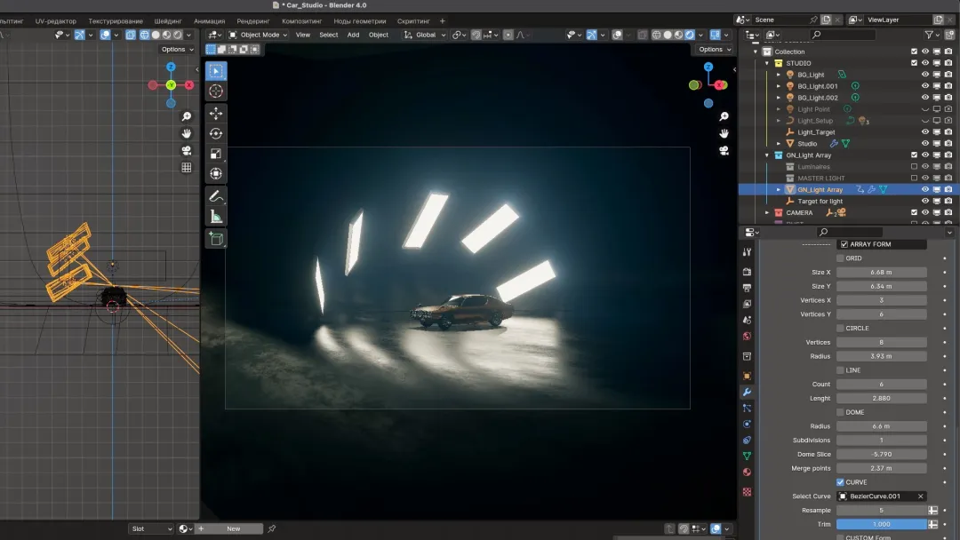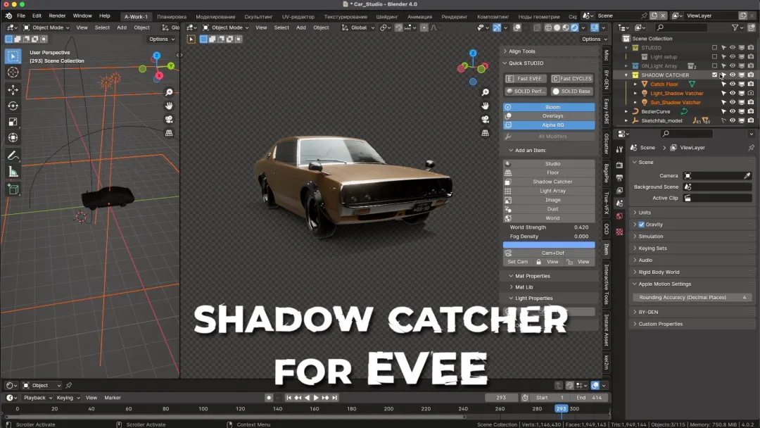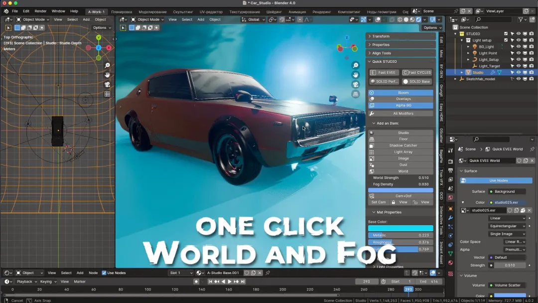 一键添加带有灯光的 Studio, 如同大型帐篷中配备的多种光源,包括 Gobo 灯光、场景真实感的尘埃效果,以及预装 HDRI 贴图的世界和快速雾效设置。此外,还有其他功能帮助你快速创建和展示 3D 内容。