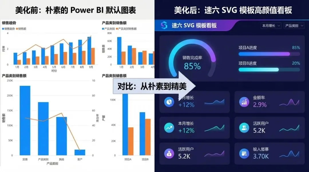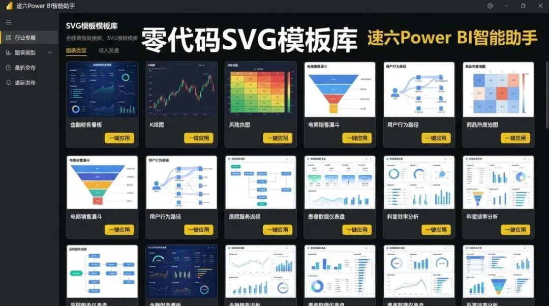 Power BI常面临原生图表表现力不足、视觉效果平庸等痛点。速六Power BI智能助手推出的SVG图形模板库,正是为了打破这一僵局。它为财务、电商、互联网及医疗健康等行业用户提供了零代码、即插即用的高级图表方案,让非技术背景的业务人员也能轻松构建极具专业感和设计感的视觉看板。通过将复杂的经营指标转化为直观的视觉语言,速六正在重新定义企业报表的生产力。