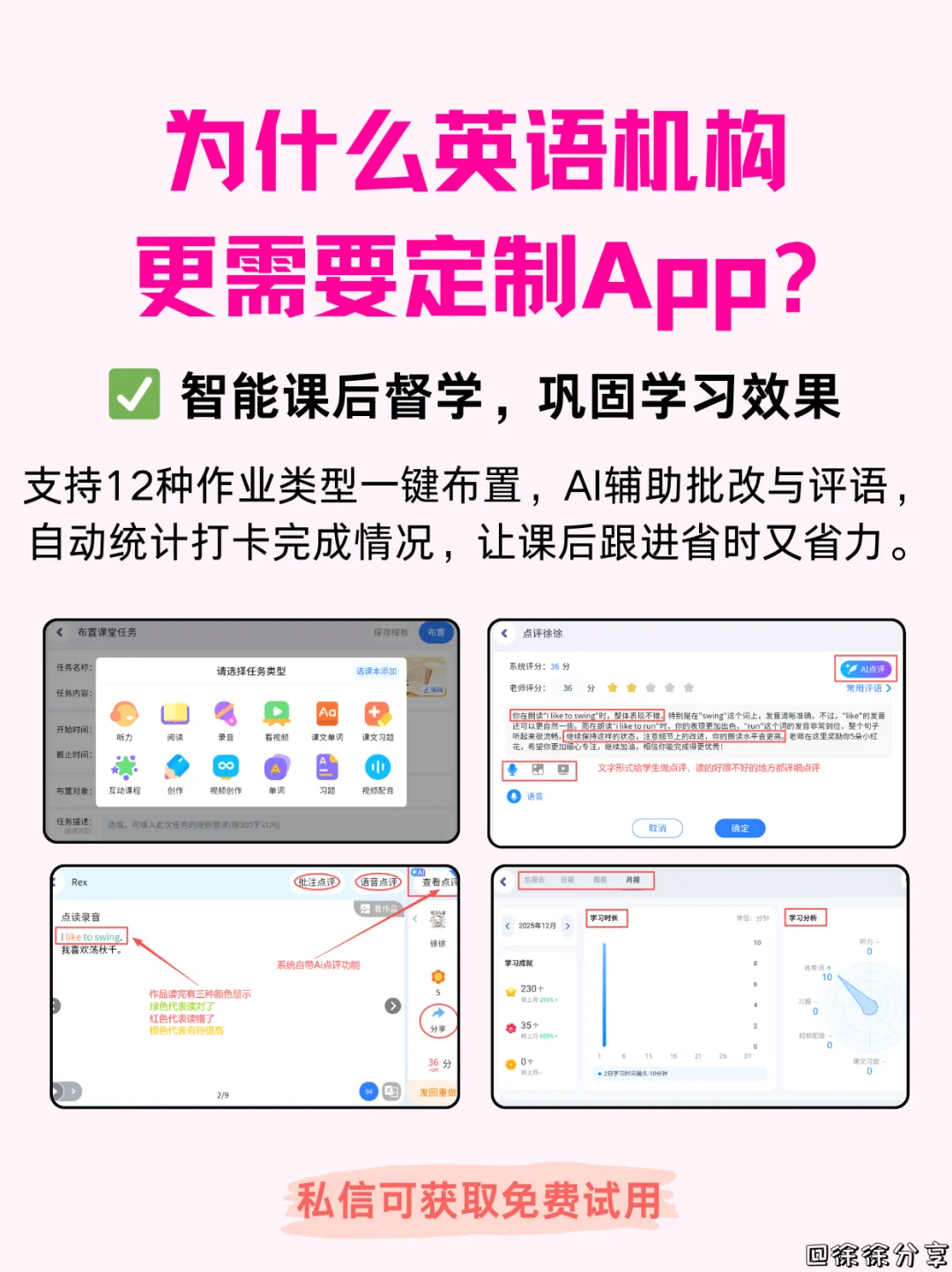 支持12种作业类型一键布置,AI辅助批改与评语,自动统计打卡完成情况,让课后跟进省时又省力。