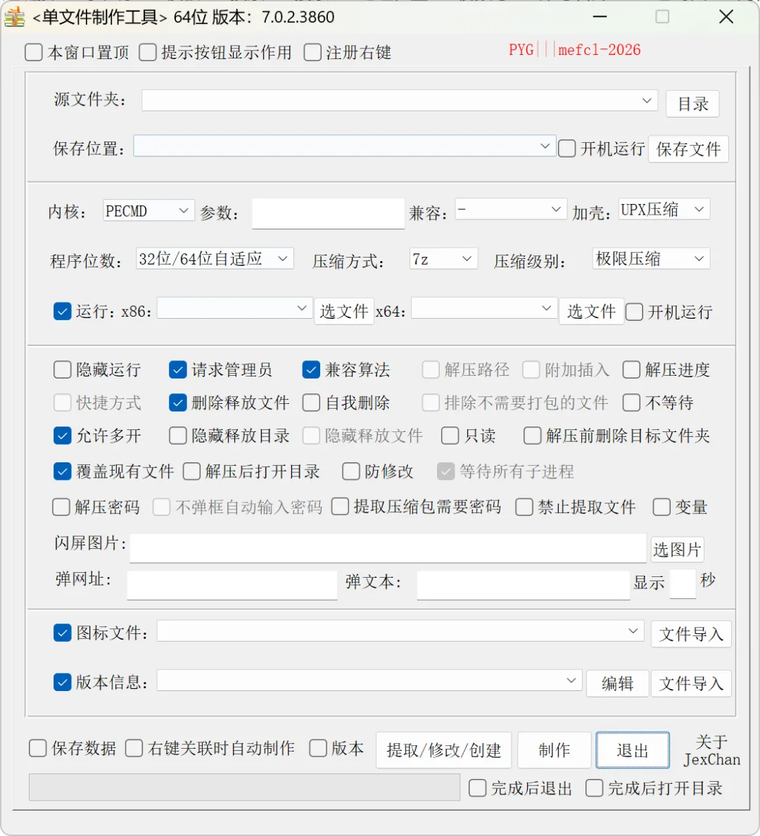 开发者把复杂技术封装成极简四步:拖入主程序 → 配置选项 → 添加文件 → 点击制作。小白也能轻松上手,做出专业的单文件!